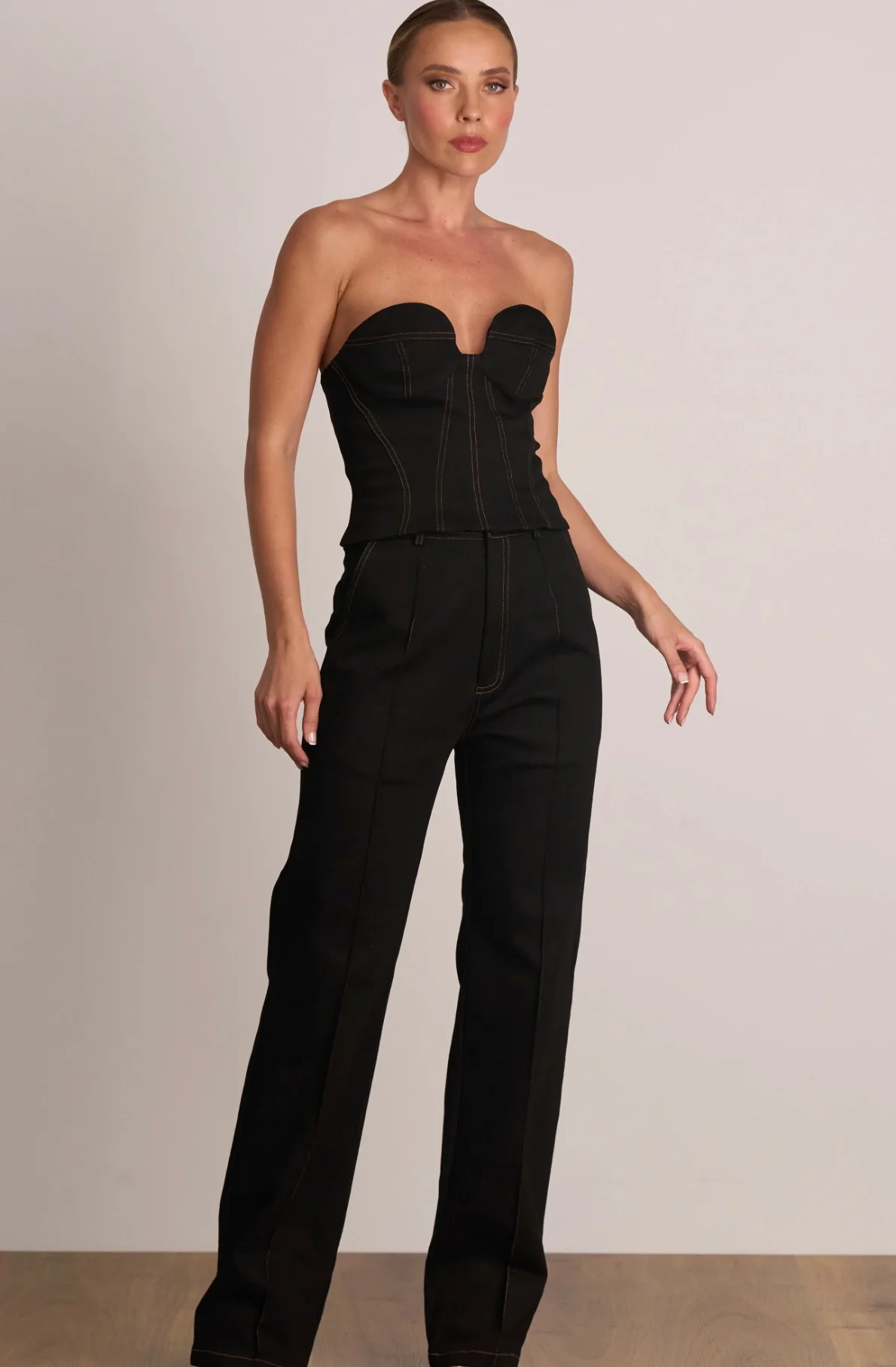 The Bleaker Bodice by PASDUCHAS is made from a stretch denim. This sleek strapless exaggerated cupped neckline features contrast stitching to enhance the look. A shirring back panelled detail secured at the center back with an exposed zipper allows for a comfort of wear.
