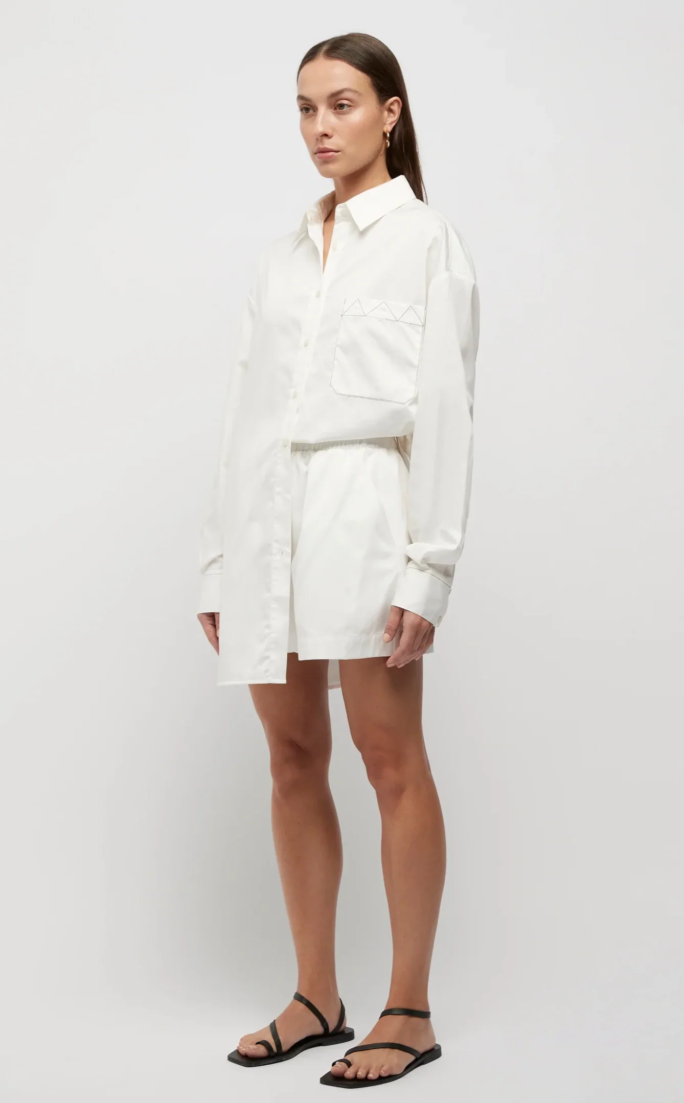 An oversized summer shirt, cut from crisp 100% Cotton poplin fabrication. Featuring a geometric pocket design, in a fine contrasting stitch.