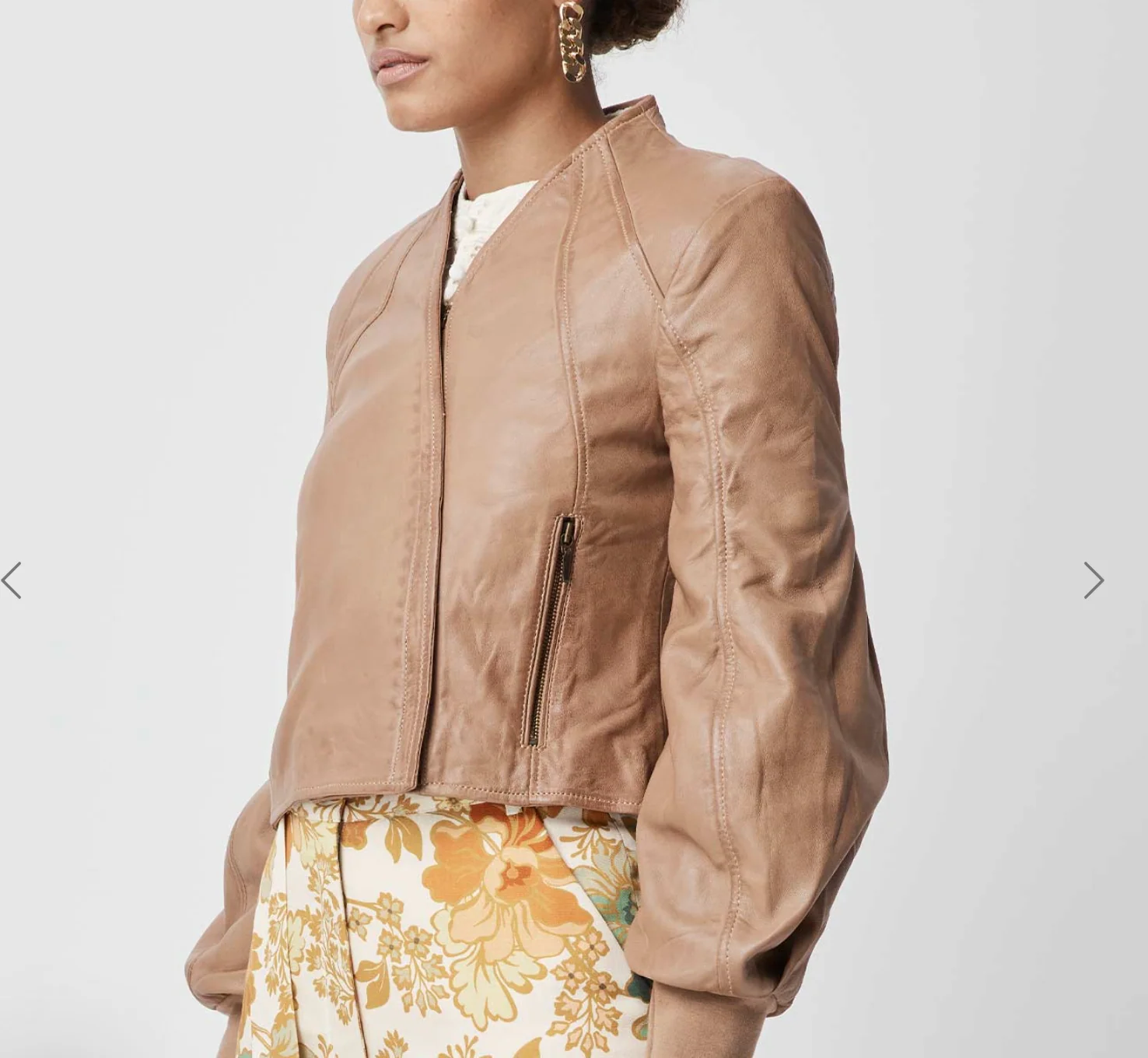 Introducing our OnceWas Farrah Volume Sleeve Leather Jacket with Rib Cuff in Husk – a luxurious piece with full volume sleeves and a stylish finish. Made from premium leather, it's fully lined and perfect for keeping you warm all winter long. Side pockets add an extra touch of functionality, while the neutral husk color makes it an easy addition to any outfit.