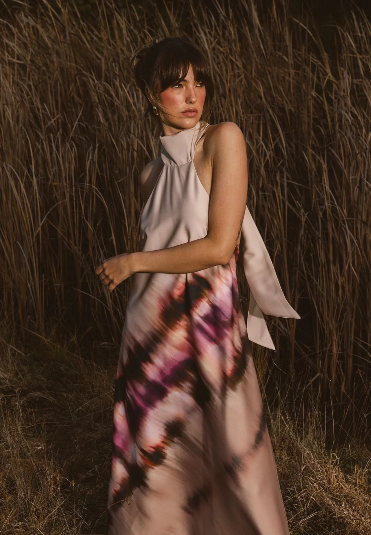 The Horizon Halter Midi by PASDUCHAS is made from a lustrous satin back crepe featuring an exclusive blur placement print. This high halter silhouette is anchored by the adjustable tie at the nape of the neck before cutting away under the arm revealing a low open statement back and falling to a subtle trapeze shaped hem.