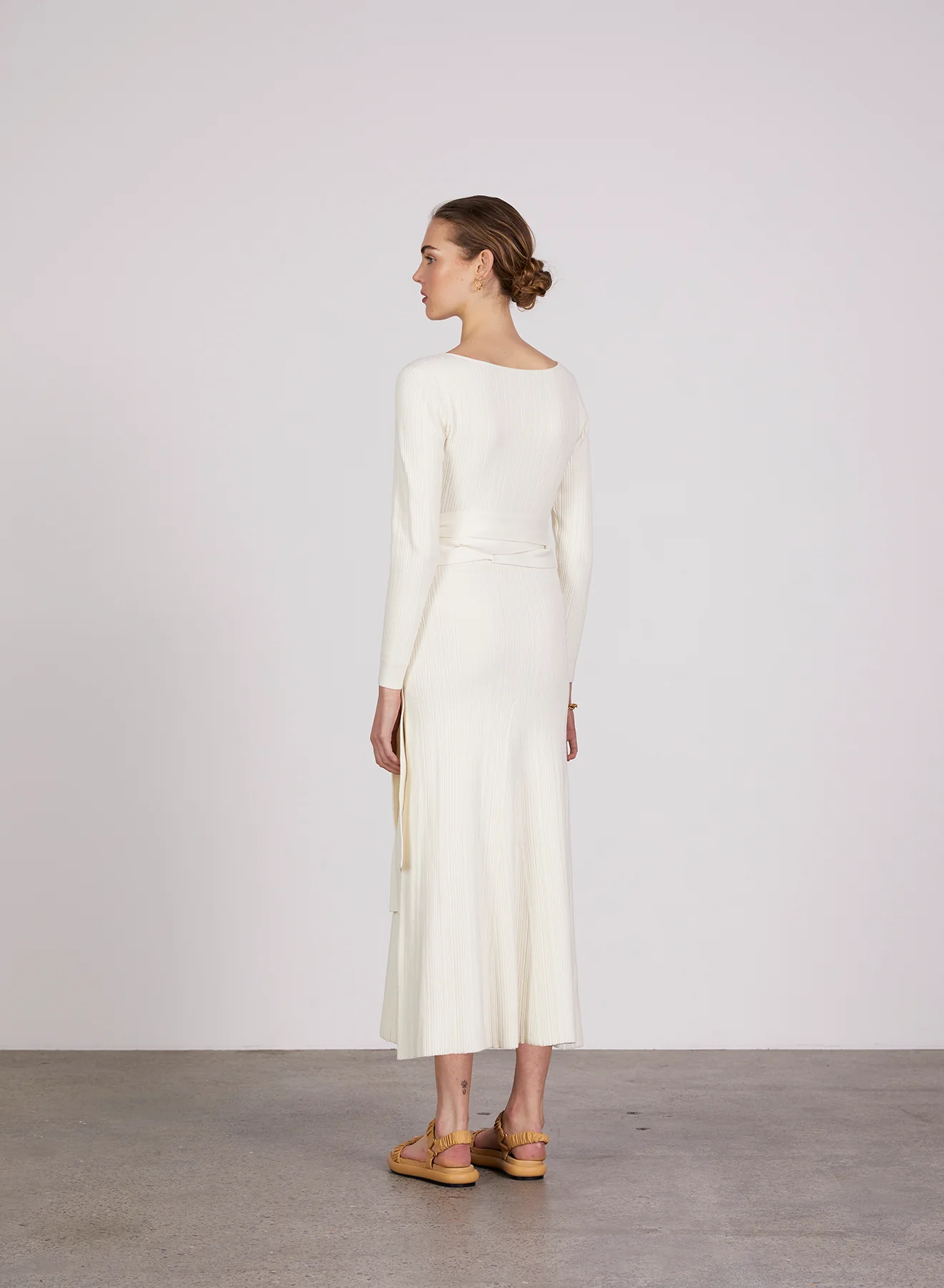 The JAQUELIN Dress is a belted maxi dress with long sleeves. This is a transeasonal and versatile piece you can reach for any occasion. The design features an elegant v-neckline, and a belt that ties around the waist. Cut from a contoured knit rib that skims over the frame, falling into a gently flared hem.