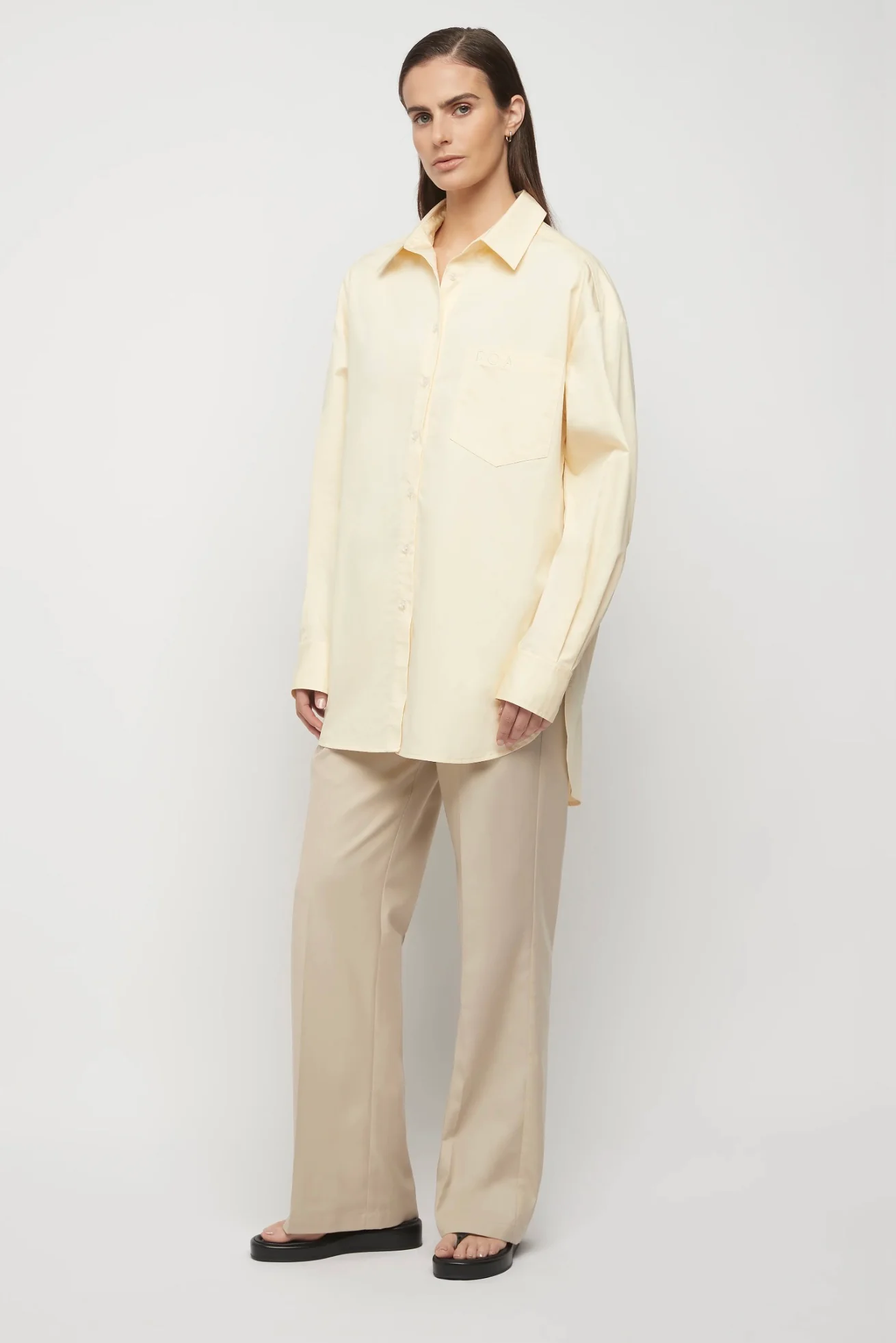 A wardrobe hero, our Friend of Audrey signature shirt crafted in a premium 100% cotton poplin fabrication. An oversized tailored shirt featuring a collar, button closure and front pocket, embossed with our Friend of Audrey monogram.