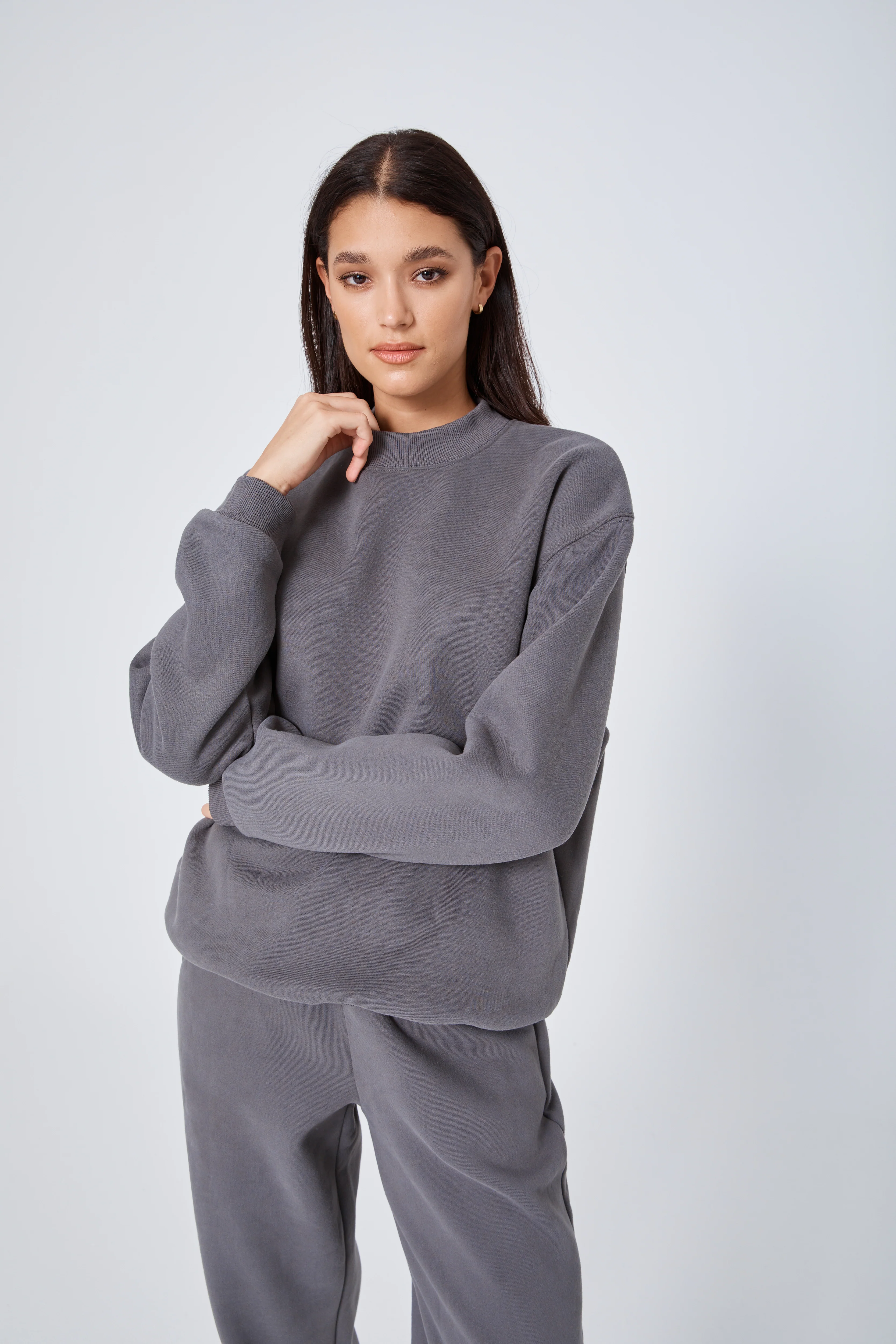 Classic crew neck sweatshirt with ribbed hem and sleeve cuff. Branded label on the left sleeve cuff. Designed to style back with The Track Pant in Stone.